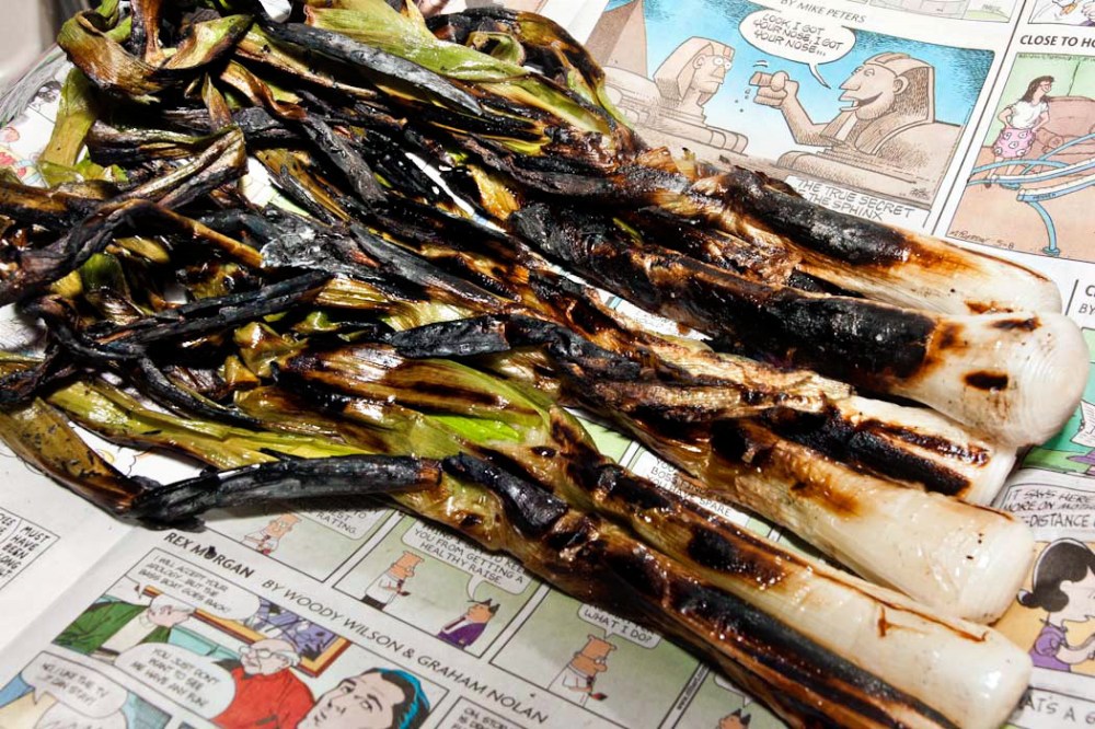 To eat: Grasp the onions at the top of the light green part (just before the onion branches out into separate green stalks). Twist this part of the onion and pull the blackened part off, leaving you with a clean, white column of onion. Dunk unabashedly in romesco, tilt your head back, and wind into your happy, waiting mouth. Alternately, dip in romesco and place on a slice of crusty bread.