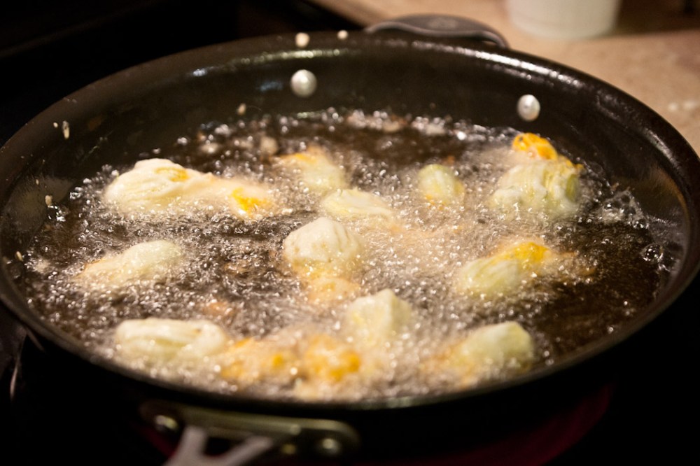 Remove the zucchini from the zucchini flowers if attached. Leaving the stem in tact, quarter the zucchini up to the stem lengthwise so that the pieces fan out slightly. Gently open the zucchini flower. There may be a protrusion inside the zucchini flower at the base. This is the, um, oh, freshman biology was so long ago…pistol…stamen…anyway, gently pull that out and rinse the inside of the zucchini flower. Open the petals and squeeze about 1 Tablespoon of the filling into the flower. Meanwhile, preheat about 1 inch of vegetable in a large skillet. I drop a little batter in the oil to see if it is hot enough. If the batter immediately sizzles, you’re good to go.