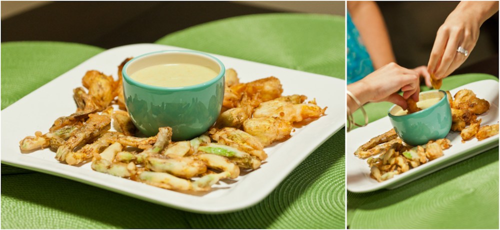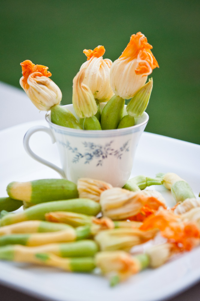 Speaking of BFFs, I’m not the only one who dances a jig when I see these beauties draped across #5 pint-sized plastic like Marlene Dietrich on a velvet sofa. Enter my friends, Emily Ruth and Jason Terry. The Terrys understand the siren song that is zucchini flower frying in fat–and they know when they get THE call from the farmers market that it is time to drop everything and come over to my house for some good eatin’! I feel I would be remiss if I didn’t give you a little back story on this. Anyone who knows Jason Terry would not ever say, “you know, I bet his favorite food is a stuffed zucchini flower.” Jason likes to drink Coors, he is a Hamburger Helper man and all around Good Ole’ Boy. One would not put the two together but when I made these the other night, he proclaimed proudly, loudly, unabashedly, “Zucchini Flowers are my favorite food!” Obviously the man has good taste…