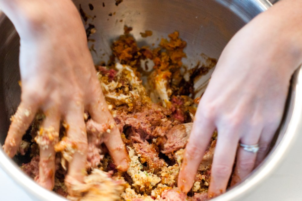 It’s fun, it’s squishy and kind of gross! Notice that I straight up pulled a Paula Deen and forgot to take my rings off. I often do…That just means they get a good polish after I finish cooking! If you must, go ahead and mix with your favorite spoon or spatula.